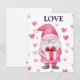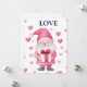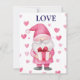 cute card with a cartoon pink gnome in love