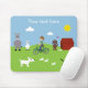 Cute mousepad / mousemat with cartoon animals (goat, donkey, butterfly, dogs, and puppies chasing a cat) and a boy riding a bike. Customize the text to suit your needs by clicking on the “Customize it” button – loads of colours and fonts to choose from.