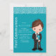 You will love this teal background with a cartoon boy dressed for his first communion with his rosary and bible.
