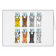 Cartoon cats standing up on their back paws, holding up pale blue cards with letters on that spell out 'Hugs Here'.