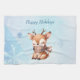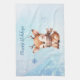 A cute cartoon deer wearing a plaid scarf sits happily amongst snowflakes. The words “Happy Holidays” can be easily changed to any message you desire.