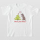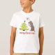 Customizable funny Christmas kid shirt with an illustration of a cute cartoon dinosaur looking at the Christmas tree and wondering why there is a heart on top of it.
