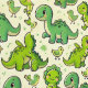 Playful and colourful pattern filled with adorable cartoon dinosaurs and small birds. The dinosaurs are various shades of green, showcasing different types with cute expressions, such as smiling and playful poses. Some dinosaur characters are depicted standing, while others are sitting or in motion. Additionally, there are cheerful little yellow birds scattered throughout the design, creating a lively and whimsical atmosphere. The background is a soft pastel colour, enhancing the cheerful and cute vibe of the overall composition.