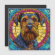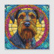 Portrait of a dog with a thick, bushy beard and expressive eyes, framed by a vibrant stained glass-like background in yellow, pink, and blue hues.