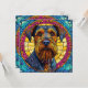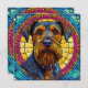 Portrait of a dog with a thick, bushy beard and expressive eyes, framed by a vibrant stained glass-like background in yellow, pink, and blue hues.