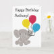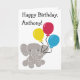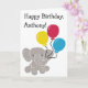 This adorable personalized birthday card features an illustration of a cute baby elephant in a simple cartoon style holding a bunch of balloons in primary colors of red, blue and yellow. Easily personalize this greeting card with your recipient's name on the front and add your own custom greeting to the inside. This cute an colorful card is perfect for children and elephant lovers.