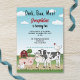 Destei's original cartoon illustration of cute farm animals including a black and white cow, a pink pig, a sheep and two chickens. On the back there is a red barn on green grassy hills together with a tree and some hay. The sky is blue with some clouds. One of the chickens is placed on top of the cow. Personalize the sample text areas with the details of your party.