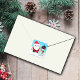 Sweet Christmas stickers depicting a cartoon santa and a cartoon snowman. The little santa has his traditional red suit and hat both with a white fur trim.He is wearing green mittens and a black belt and black shiny boots. He has big blue eyes and rosey cheeks, probably from the cold winters day. Last but not least he has a big white fluffy beard. His friend the happy snowman. He has black coal for eyes and his smiling mouth and a carrot for his nose. Upon his head he wears a black top hat with a red band and around his neck a warm green and red scarf. Twigs for arms and three black buttons down his big snowball front. The background is a winters day with falling snowflakes. A very jolly pair would brighten up anywhere a sticker can stick. Check out more stickers