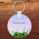 This whimsical keychain for those who love frogs features a green frog with big eyes peeking to the side from between blades of grass at the bottom margin of the design under a pink and blue sky and can be personalized with her name and monogram - by katz_d_zynes