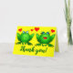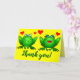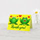Happy green cartoon frogs with blue eyes, red hearts and a cheerful yellow background. This card says "Thank you!" in a cool dancing script style, and is blank inside so you can write your personal message of wit and wisdom. If you want different words on front, you can change the text right on the product page. Frogs can represent friendship, affection, romance, dreams, music and singing, celebration, happiness, good luck and good health. Send or give this to friends and family, a cute couple, neighbour, teacher or volunteer, or anyone who deserves a heartfelt thanks. This is a hand drawn original frog design by M Sylvia Chaume, Canada. Hoppy Blessings!