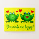 You make me hoppy! Great fun for kids or adults, a cheerful design featuring boy and girl green cartoon frogs with googly eyes and friendly smiles, bold red love hearts and a funny pun. Super idea for birthdays, Christmas, visiting Grandma day, family fun day or anytime you please. This design is customizable. You can change the text to your own words of wit and wisdom. You can change the size and number of pieces of the puzzle, as desired. I've made the background a happy bright yellow, but you can also change that if you want by using the customize option. Frogs are symbols of happiness, humour, society or community, celebration, friendship, music, singing, dreams and the subconscious, good health and blessings of fortune, associated with the element Water. This is an original hand drawn design by M Sylvia Chaume, Canada. Hoppy Blessings!