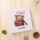 Box is wrapped in red, and a bow with a little hearts pattern.