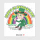 A vinyl with an Illustration of a cute smiling leprechaun wearing a green suit, a top hat while holding a shamrock leaf, with a colourful rainbow in the background and text saying "Happy St. Patrick's Day"