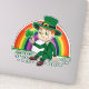Vinyl Sticker with an Illustration of a cute smiling leprechaun wearing a green suit, a top hat while holding a shamrock leaf, with a colourful rainbow in the background