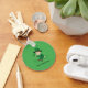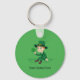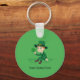 Keychain with an Illustration of a cute smiling leprechaun wearing a green suit, a top hat while holding a shamrock leaf