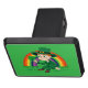 Hitch Cover with an Illustration of a cute smiling leprechaun wearing a green suit, a top hat while holding a shamrock leaf, with a colourful rainbow in the background