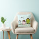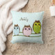 Cute child's bedroom accent pillow done in a light blue background. Cartoon graphics of a blue and brown, a pink and brown and a green and brown owl sitting on green branches decorates the front and back of the pillow. Personalize the whimsical brown text for your child's room.