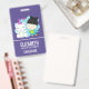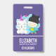 Name badge with a whimsical image of a unicorn and bird. This pair is happily smiling while hanging out together. A little heart hovers above their head. Unicorn is white with angel wings and a pink horn. The bird is a greenish blue colour wearing a black toque with black kitty cat with ears. A blue cloud placed behind these happy best friends.