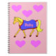 Cute cartoon palomino pony wearing a blue rug with red edging. Image can easily be personalized by editing the template text to change the name/remove it or change it to a message of your own choice. Notebook background is pale pink with brighter pink hearts. Cute present for any horse lover.