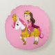 Throw Pillow with an illustration of a happy princess wearing a pink dress riding a pony, nice present for little girls and a great decoration for a nursery or girl's bedroom
