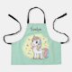 This adorable, personalized girls' apron features a cute unicorn with a pastel rainbow mane and tail, sparkling golden horn, and sweet heart accents, set against a soft yellow and teal background with scattered hearts and stars.