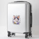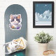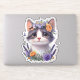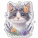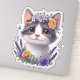 A charming sticker featuring a grey and white cat with big, expressive eyes, wearing a delicate floral crown made of lavender, daisies, and vibrant orange and purple roses.