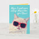 For cat lovers, a white cat wearing red sunglasses asking for catnip. Alexa seems to be ignoring the cat (which cats are usually famous for). Inside it says, "Forget Alexa! Just have a happy birthday!" Inside text is customizable.