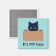 Cute Kawaii cat in a cardboard box with caption “it’s MY box” on a blue green background