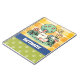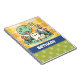 An adorable notebook of a cute doodle style art cartoon kitty cat sitting peacefully in a beautiful garden. The cat is a pale cream colour with orange stripes along it's body and tail. She is resting on green grass surrounded by pink, blue and yellow flowers. In the background is a green tree with heart shaped fruit and a happy yellow sun against a pale blue sky. This whimsical illustration would suit anyone of any age especially children and cat lovers. The background to the illustration is a yellow check pattern. Below the illustration is a blue band with white lettering to add your name or other text to personalize. Below is a green space with light green paw prints.