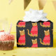 Black gift wrap patterned with cute cartoon ginger cats, wearing red Christmas jumpers.