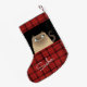 Cute, carton, funny Siamese cat, black and red buffalo check monogrammed Christmas stocking with custom pet's name.