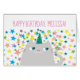 Cute, cartoon grey cat unicorn Happy Birthday greeting card for girl with whimsical stars!