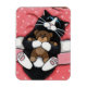 Flexible magnet featuring a painting of black and white cat lying on a bed clutching a teddy bear. Art by Lisa Marie Robinson.