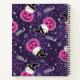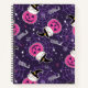 A personalized spiral notebook with an adorable Halloween themed pattern. Cats in witches hats, sitting on pink pumpkins with purple cobwebs in the background.