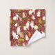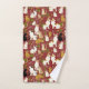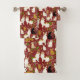Towel set in a whimsical pattern of cats in natural poses, surrounded by green foliage and flowers, set against a burgundy red / maroon background, creating a charming and cozy aesthetic