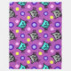 A large size fleece blanket featuring a cute, colourful pattern design of grey and teal cats against a purple violet background with multicolored polka dot accents.