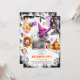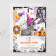 L'invitation présente un adorable chat portant un casquette sorcier violet, entouré de divers symboles d'Halloween comme les araignées, les chauves-souris et les citrouilles de jack o'lanterne. En plus du thème éffrayant, le dos de la carte d'invitation est orné d'un motif de chats.