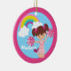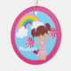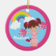 A pretty pink cheerleading Christmas ornament gift for a girl who loves to cheer. Features a cute girl jumping in the air with pink pom poms and a beautiful rainbow on the sky background. Customize with your name.