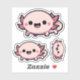 This delightful design features a whimsical axolotl, a neotenic salamander known for its regenerative abilities. The axolotl is illustrated in a charming, cartoonish style with a round body and an oversized head. Its soft pink skin is accented with darker pink highlights on the gills, which resemble delicate, leafy fronds. The creature’s wide, expressive eyes and broad smile give it an endearing and friendly appearance. Its short limbs and gently curling tail add to the playful and imaginative nature of the design. This adorable axolotl is perfect for those who love unique and cute aquatic creatures.