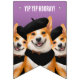 Celebrate your little one's birthday with these cute bunting flags, which feature AI-generated artwork of Welsh Corgi Dogs, smiling for the camera and smartly outfitted in chic black berets, black bandanas, and brown bowties on alternating purple and black backgrounds.