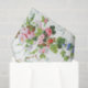 Very pretty vintage-inspired mixed bouquets of pink and yellow roses, blue morning glories and hydrangeas, green vines, pink and purple daisies and wildflowers, sage green and rust leaves with delicate pastel teal leaf pattern on white background.