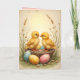 This custom card features a wonderful Easter motif in nostalgic vintage style - cute chicks and colorful Easter eggs in a basket, weeds, blurry background. Pretty colors in yellow, blue and pink. Beautiful for your Easter greetings!