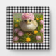 Pretty tabletop plaque features a digital art painting of a baby chick among pink and yellow flowers with black and white gingham check border background.
