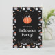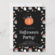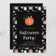 Cute children's halloween party invitation with an illustration of a pumpkin bucket of treats and a background of cauldrons, ghosts and bats. Illustrated and designed by Patricia Alvarez.
