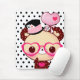 Cute chocolate bear wearing heart-shaped pink glasses and Mat Hatter Hat with lovely balloon on black polka dots.