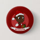 Round button with an illustration of a cute smiling happy black baby girl or boy, the baby is wearing red and white clothes and holding a present; with editable text template for your name or message, Christmas holidays design with a red background
