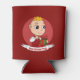 Can cooler with an illustration of a cute smiling happy baby girl or boy, the baby is wearing red and white clothes and holding a present; with editable text template for your name or message, Christmas holidays design with a red background