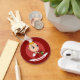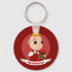 Keychain with an illustration of a cute smiling happy baby girl or boy, the baby is wearing red and white clothes and holding a present; with editable text template for your name or message, Christmas holidays design with a red background
