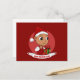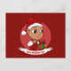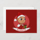 Postcard with an illustration of a cute smiling happy baby girl or boy, the baby is wearing red and white clothes and holding a present; with editable text template for your name or message, Christmas holidays design with a red background