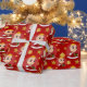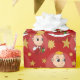 Christmas wrapping paper with an illustration of a cute smiling happy baby girl or boy, the baby is wearing red and white clothes and holding a present; with editable text template for your name or message, Christmas holidays design with a seamless red background with stars